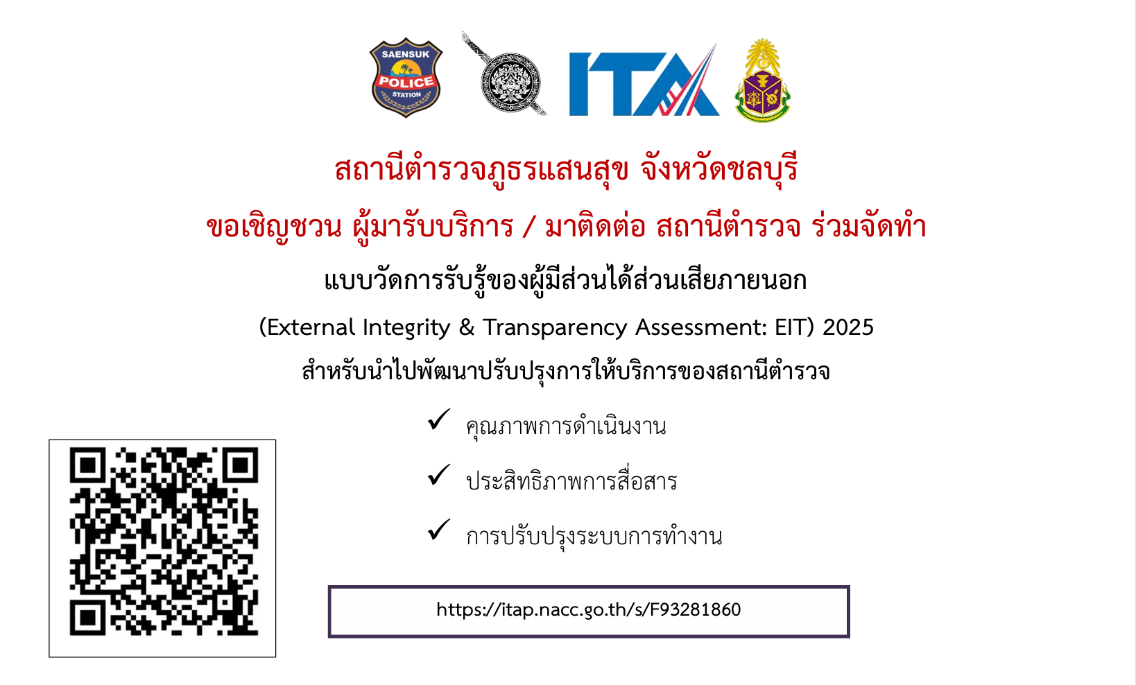 พ.ต.อ.ปัญจนนท์ วิจิตรโท ผกก.สภ.แสนสุข เป็นประธานการประชุม ซึ่งการประชุมดังกล่าวมีวัตถุประสงค์ เพื่อแจ้งคำสั่งแต่งตั้งคณะกรรมการขับเคลื่อนการประเมินคุณธรรมและความโปร่งใสในการดำเนินงานของหน่วยงานภาครัฐ (Integrity and Transparency Assessment: ITA) ของสถานีตำรวจ และทำความเข้าใจกรอบการประเมินคุณธรรมและความโปร่งใสในการดำเนินงานของหน่วยงานภาครัฐ (Integrity and Transparency Assessment: ITA) ของสถานีตำรวจ ประจำปีงบประมาณ พ.ศ. 2568 ประกอบด้วย 3 ประเด็นสำคัญ ได้แก่
